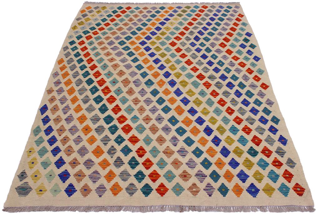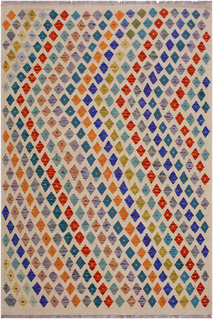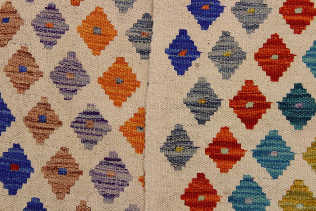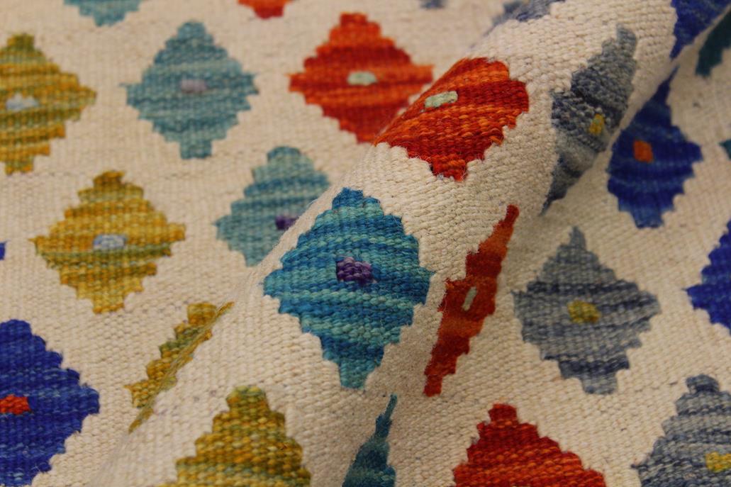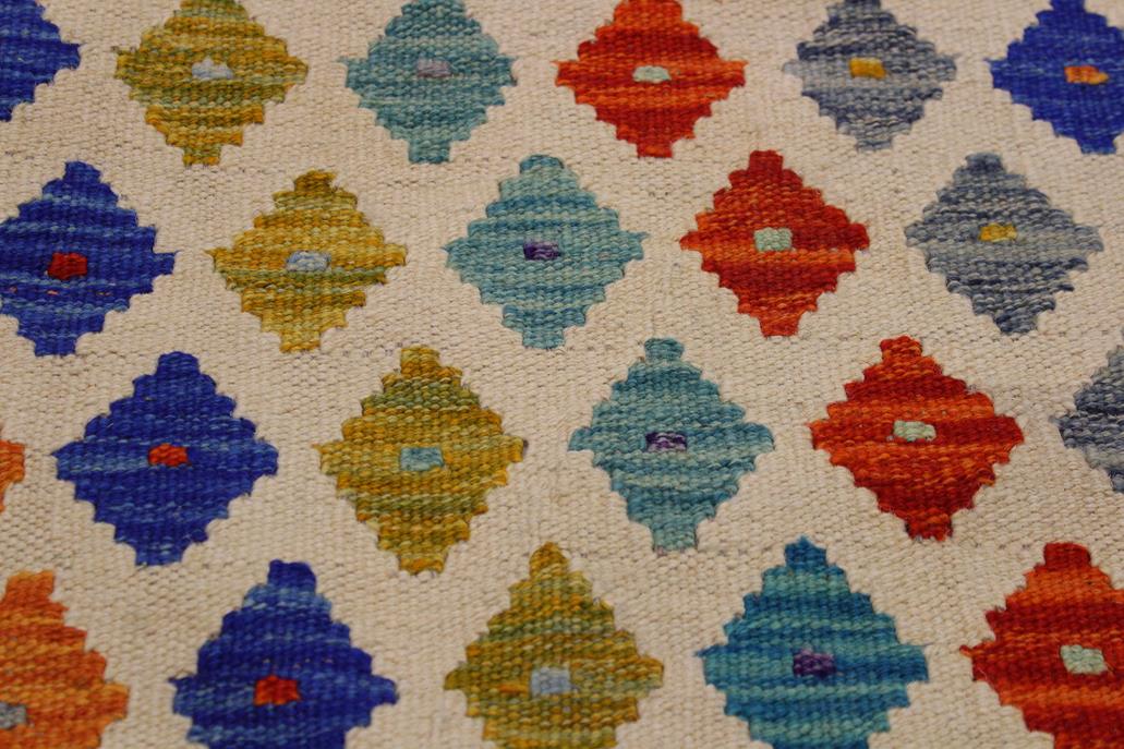 Elevate the elegance of your home with this stunning hand-woven tribal Kilim wool rug. Meticulously crafted on a loom by the Nomad Turkman people using hand-spun wool and 100% natural vegetable dyes, these rugs are recognized for their repetitive geometric patterns, incorporating naturalistic floral and traditional designs. The contemporary fashion palette results in bold, sharp patterns that are incredibly versatile, as the pattern is the same on both sides. These reversible rugs feature a lighter shade on one side and brighter colors on the other, providing versatility according to preference. These unique rugs are made by knotting short strands of different colors onto the warps and securing them by tightly pressing the wefts. The designs are created by interweaving the various colored wefts and warps. Kilims are known for their exceptional durability and versatility, making them truly unique rugs.