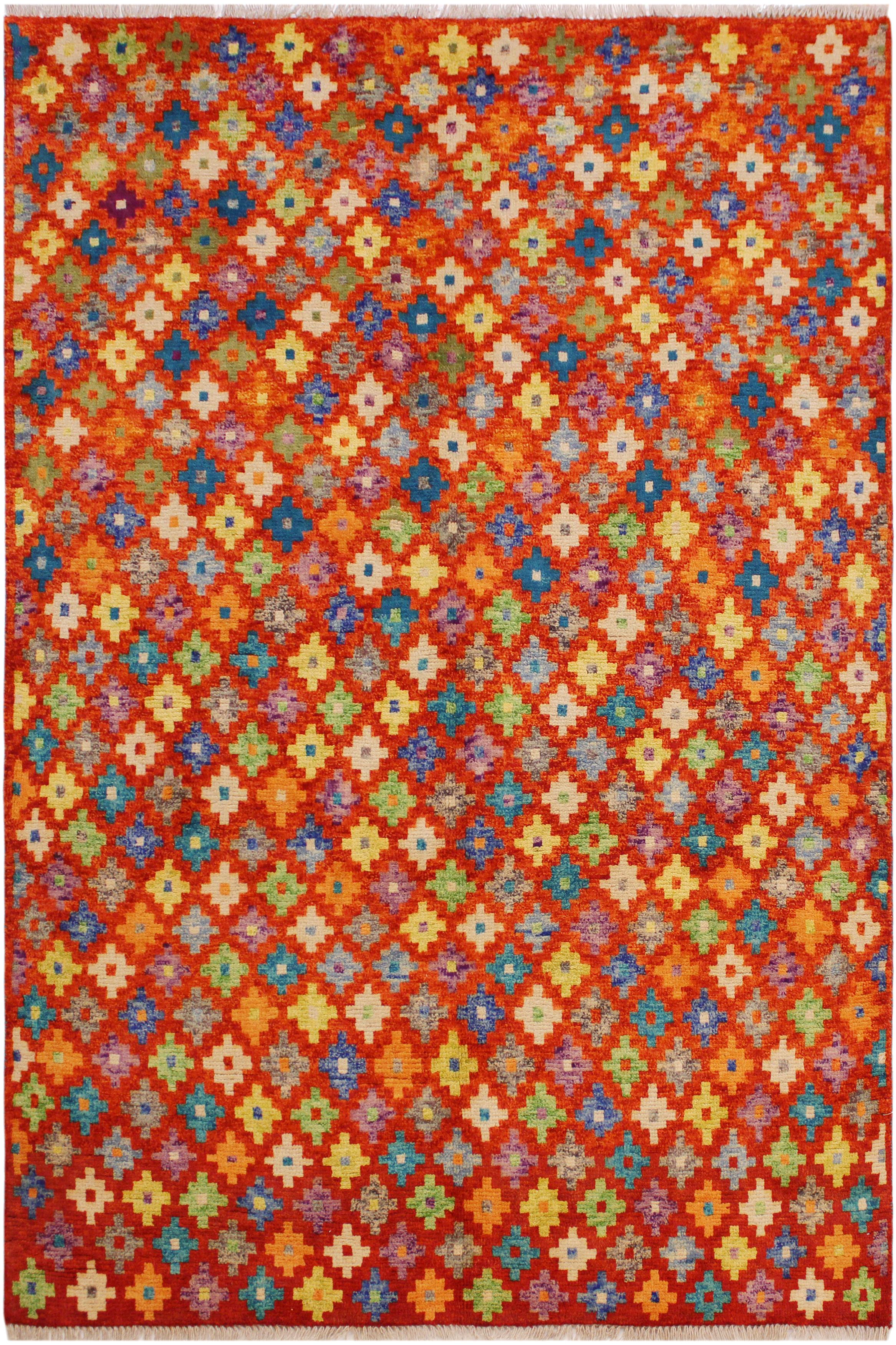 Contemporary Balochi Christop Orange/Green Wool Rug - 5'0'' x 6'6''